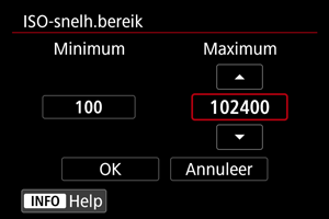 U kunt het bereik van de handmatige ISO-snelheid instelling instellen (de minimum- en maximumgrenzen). U kunt de minimumgrens instellen tussen L (gelijk aan ISO 50) en ISO 102400 en de maximumgrens tussen ISO 100 en H (gelijk aan ISO 204800).