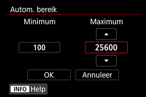 U kunt het automatische ISO-snelheidsbereik voor ISO auto instellen tussen ISO 100–102400. Het minimum kan worden ingesteld binnen ISO 100-51200 en het maximum binnen ISO 200-102400, in stappen van 1 stop.