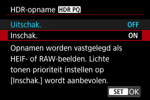 ] ingesteld op [Inschak.], voor afspelen op een apparaat met HDR-weergave, stelt u [