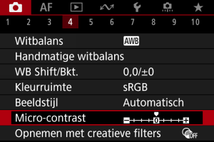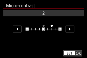 - Instelling van het micro-contrast kan de gebieden rond de grenzen van beelden met een hoog contrast donkerder of lichter maken.