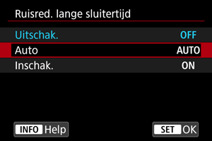 Bij beelden met een belichtingstijd van 1 seconde of langer wordt ruisreductie automatisch uitgevoerd wanneer er ruis wordt gedetecteerd die typerend is voor lange belichting. Deze instelling is in de meeste gevallen afdoende.