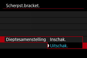 - Selecteer [Uitschak.] als u liever niet wilt compenseren voor veranderingen in de helderheid van beelden tijdens scherpstelbracketing. Gebruik deze optie voor andere doeleinden dan dieptecompositie van de vastgelegde beelden in Digital Photo Professional ().