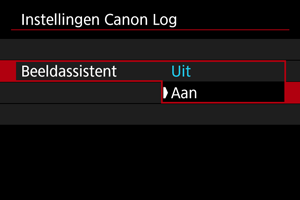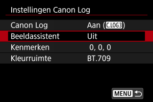 - Als u deze functie instelt op [Aan], heeft dit geen invloed op video's die zijn opgeslagen op de kaart met behulp van Canon Log-kenmerken. Op gelijke wijze heeft HDMI-video-output Canon Log-kenmerken en wordt Beeldassistent daar niet voor gebruikt.