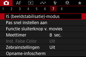 - Zie Image Stabilizer (Beeldstabilisator) (IS-modus) voor informatie over het configureren van de beeldstabilisatie.