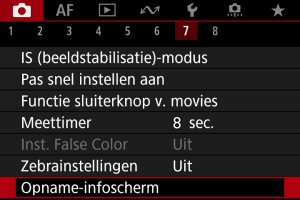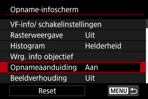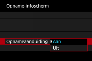 U kunt de details en schermen met informatie die tijdens het opnemen van video's worden weergegeven, aanpassen op het scherm of in de zoeker.