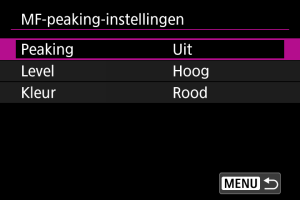 - MF-pieken kunnen moeilijk te onderscheiden zijn bij hoge ISO-snelheden, vooral wanneer ISO vergroten is ingesteld. Verlaag indien nodig de ISO-snelheid of stel [Peaking] in op [Uit].