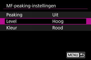 Randen van onderwerpen waarop is scherpgesteld kunnen in kleur worden weergegeven om het scherpstellen te vereenvoudigen. U kunt de omtrekkleuren instellen en de gevoeligheid (niveau) van de randdetectie aanpassen.