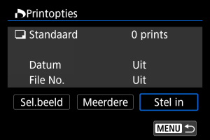 U kunt het afdruktype instellen en instellen of de datum en het bestandsnummer moeten worden afgedrukt, enzovoort. De afdrukinstellingen worden toegepast op alle beelden die zijn geselecteerd om te worden afgedrukt. (Ze kunnen niet voor elk beeld afzonderlijk worden ingesteld.)