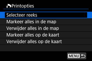 Als u [Verwijder alles op de kaart] selecteert, worden de afdrukopties voor alle beelden op de kaart gewist.