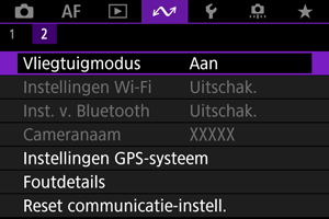 Als u de verbinding met de camera via Wi-Fi of Bluetooth niet wilt behouden wanneer deze is uitgeschakeld, stelt u [: Vliegtuigmodus] in op [Aan] of stelt u [