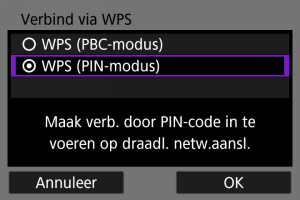 Deze verbindingsmethode is beschikbaar bij gebruik van een access point dat compatibel is met WPS. Bij de verbindingsmethode met PIN-code (PIN-modus) wordt er een 8-cijferig identificatienummer dat op de camera is opgegeven, op het access point ingesteld om verbinding tot stand te brengen.