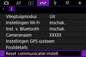 • Alle draadloze communicatie-instellingen kunnen worden gewist door de optie [Communicatie-instellingen] te selecteren voor [Overige instell.] in [Instellen: Camera resetten].
