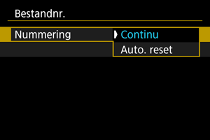 Aan de vastgelegde beelden die in een map zijn opgeslagen, wordt een bestandsnummer toegekend van 0001 tot 9999. U kunt de nummering van de beeldbestanden wijzigen.