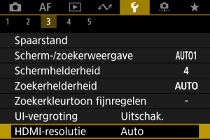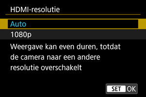 Stel de uitgangsresolutie voor beelden in die gebruikt wordt als de camera met een HDMI-kabel wordt aangesloten op een televisie of extern opnameapparaat.
