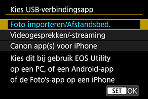 Selecteer dit als u EOS Utility gebruikt nadat u de camera met een computer hebt verbonden, of als u speciale Android-apps of de iOS-versie van Photos gebruikt.