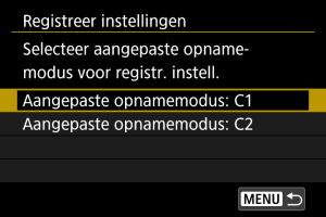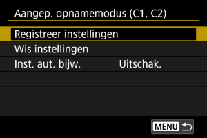 - Afhankelijk van de menu-items worden opties die in andere opnamemodi zijn gewijzigd, mogelijk niet meegenomen naar de instellingen voor de aangepaste opnamemodus.