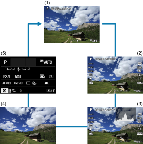 In de basismodi wordt het scherm bij (5) niet weergegeven.