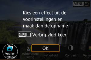 - Deze instellingen worden opnieuw ingesteld wanneer u van opnamemodus wisselt of de camera uitschakelt. Om de instellingen op te slaan stelt u [