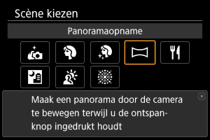 Gebruik de modus [] (Panoramaopname) om panorama's op te nemen. Het panorama wordt gegenereerd door opnamen te combineren van continue opnamen terwijl u de camera in één richting beweegt en de ontspanknop volledig ingedrukt houdt.