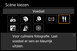 Gebruik de modus [] (Voedsel) voor culinaire fotografie. De foto wordt scherp en aantrekkelijk. De roodachtige tint die wordt veroorzaakt door de lichtbron, wordt bovendien onderdrukt in opnamen die worden gemaakt bij kunstlicht, enzovoort.