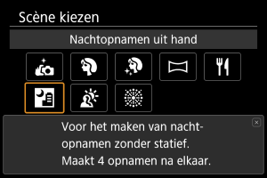 De modus [] (Nachtopnamen uit hand) maakt het maken van opnamen uit de hand voor nachtopnamen mogelijk. In deze opnamemodus worden voor elke opname vier foto's achter elkaar gemaakt. Deze worden vervolgens gecombineerd en opgeslagen als één beeld met verminderde cameratrilling.