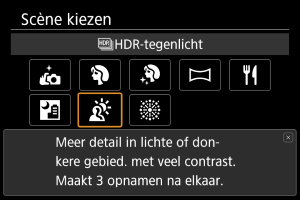 HDR-tegenlicht) voor scènes met tegenlicht en zowel lichte als donkere gebieden. Bij het maken van opnamen in deze modus worden drie opeenvolgende beelden met verschillende belichtingen gemaakt, die worden gecombineerd om een enkel HDR-beeld te maken waarin details in schaduwen worden weergegeven die anders verloren kunnen gaan vanwege tegenlicht.