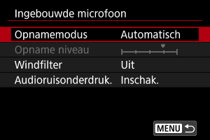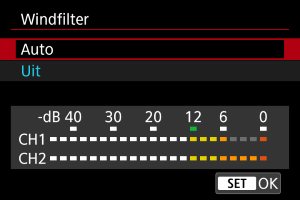 Beschikbaar wanneer u de ingebouwde microfoon gebruikt, of de externe multifunctieschoenmicrofoons die compatibel zijn met windfilters.