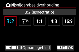 - RAW-beelden worden, wanneer Bijsnijden/aspect ratio is ingesteld op [1:1], [4:3] of [16:19], opgenomen in de aspect ratio [3:2] met toegevoegde bijsnijdinformatie voor de geconfigureerde aspect ratio. Met deze informatie kan Digital Photo Professional (EOS-software) een beeld genereren met de geconfigureerde aspect ratio.