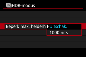 - Met [Uitschak.] is maximumhelderheid niet beperkt. Aanbevolen wanneer u beelden op een monitor bekijkt die beelden met een helderheid van meer dan 1000 nits ondersteunt.