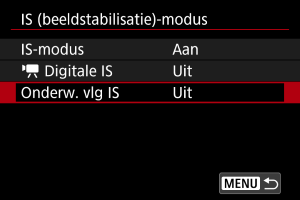 Selecteer [Altijd aan] voor voortdurende beeldstabilisatie. [Alleen voor opn]: beeldstabilisatie is alleen actief op het moment van opname.