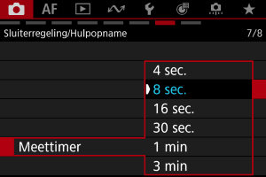 U kunt instellen hoe lang de meettimer actief is (wat de duur van de belichtingswaardeweergave bepaalt) nadat deze automatisch is geactiveerd door een actie zoals het half indrukken van de ontspanknop.