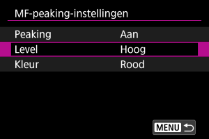 Randen van onderwerpen waarop is scherpgesteld, kunnen in kleur worden weergegeven om het scherpstellen te vereenvoudigen. U kunt de omtrekkleuren instellen en de gevoeligheid (niveau) van de randdetectie aanpassen.