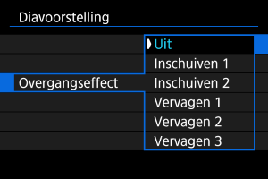 - Stel [Weergaveduur], [Herhalen] (herhaald afspelen) en [Overgangseffect] (effect bij het wisselen van beeld) in voor de foto's.