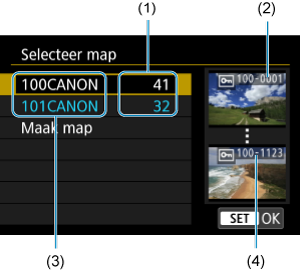 - Een map kan maximaal 9999 beelden bevatten (bestandsnummers 0001-9999). Wanneer een map vol raakt, wordt er automatisch een nieuwe map gemaakt met een mapnummer dat één cijfer hoger is. Ook wanneer de bestandsnummering handmatig opnieuw is ingesteld (), wordt er automatisch een nieuwe map gemaakt. Er kunnen mappen worden gemaakt met de nummers 100 t/m 999.