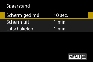 - Als tijdens menuweergave of beelden afspelen de tijd ingesteld in [Scherm gedimd], [Scherm uit] en [Uitschakelen] is verstreken, schakelt de camera uit.