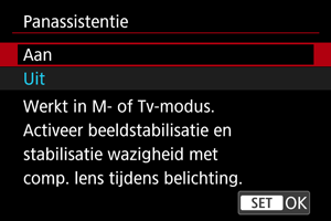 Door te pannen met compatibele lenzen kan beweging van de camera en vervaging van onderwerpen worden gecorrigeerd. Geldt voor de modus [M] of [Tv].