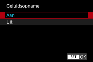 Selecteer [Aan] voor geluidsopname tijdens video-opnamen. De ingebouwde microfoon wordt gebruikt voor opname, tenzij u microfoons gebruikt die extern zijn of die bedoeld zijn voor de multifunctieschoen.