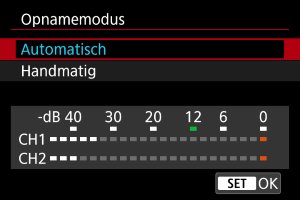 - Opnameniveaus worden weergegeven in een niveaumeter onder aan het scherm.