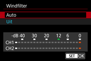 Beschikbaar wanneer u de ingebouwde microfoon gebruikt, of de multifunctieschoenmicrofoons die compatibel zijn met windfilters.