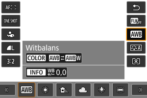 ] (Witprioriteit) zal doorgaans automatisch de juiste witbalans worden ingesteld. Als u met de instelling Auto geen natuurlijke kleuren krijgt, kunt u een witbalans selecteren die bij de lichtbron past of de witbalans handmatig instellen door een opname van een wit voorwerp te maken.