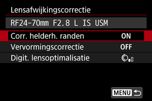 - Met [Digit. lensoptimalisatie] ingesteld op [Standaard] of [Hoog], worden [Corr. chromat. afw.] en [Diffractiecorrectie] niet weergegeven, maar deze zijn beide ingesteld op [Inschak.] voor opname.