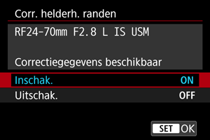 - Wanneer u een niet-Canon-lens gebruikt, wordt aanbevolen om de correcties in te stellen op [Uitschak.], zelfs als [Correctiegegevens beschikbaar] wordt weergegeven.