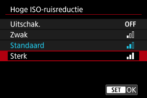 U kunt de gegenereerde beeldruis verminderen. Deze functie is met name effectief bij het maken van opnamen met hoge ISO-snelheden. Bij opnamen met lage ISO-snelheden kan de ruis in de donkerdere gedeelten van het beeld (de schaduwpartijen) verder worden gereduceerd.