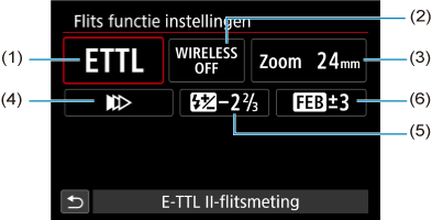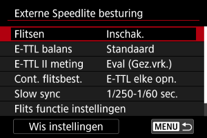 Functies van Speedlites uit de EL/EX-serie die compatibel zijn met flitsfunctie-instellingen, kunnen worden ingesteld via een cameramenuscherm. Bevestig de Speedlite op de camera en schakel de Speedlite in voordat u de flitsfuncties instelt.