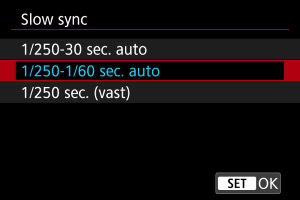 Stel deze optie in op [Hogesnelheidssynchronisatie] voor flitsfotografie bij kortere sluitertijden dan de flitssynchronisatietijd. Dit is effectief bij het maken van opnamen met een open diafragma in de modus [Av] om bijvoorbeeld bij daglicht de achtergrond achter onderwerpen buitenshuis te vervagen.