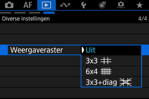 U kunt een raster over foto's weergeven bij weergave van één opname op het afspeelscherm. Deze functie is handig om de verticale en horizontale kanteling en de compositie van het beeld te controleren.