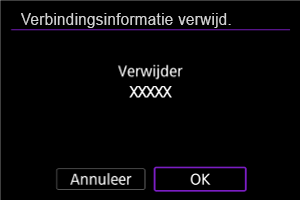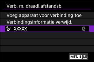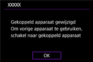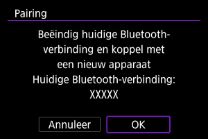 - Als de camera al aan een ander apparaat is gekoppeld, wordt een bericht weergegeven. Selecteer [OK] om de huidige Bluetooth-verbinding te beƫindigen.