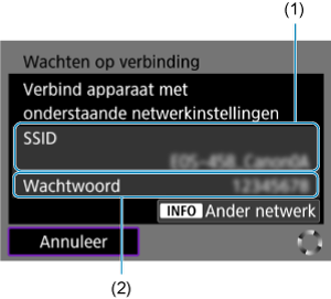 - Controleer de SSID (1) en het Wachtwoord (2) die op het camerascherm worden weergegeven.