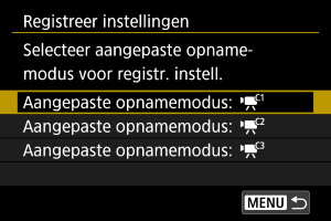 - Afhankelijk van de menu-items worden opties die in andere opnamemodi zijn gewijzigd, mogelijk niet meegenomen naar de instellingen van aangepaste opnamemodi.