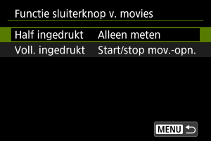 U kunt de functies instellen die tijdens het opnemen van video's worden uitgevoerd wanneer u de ontspanknop half of volledig indrukt.